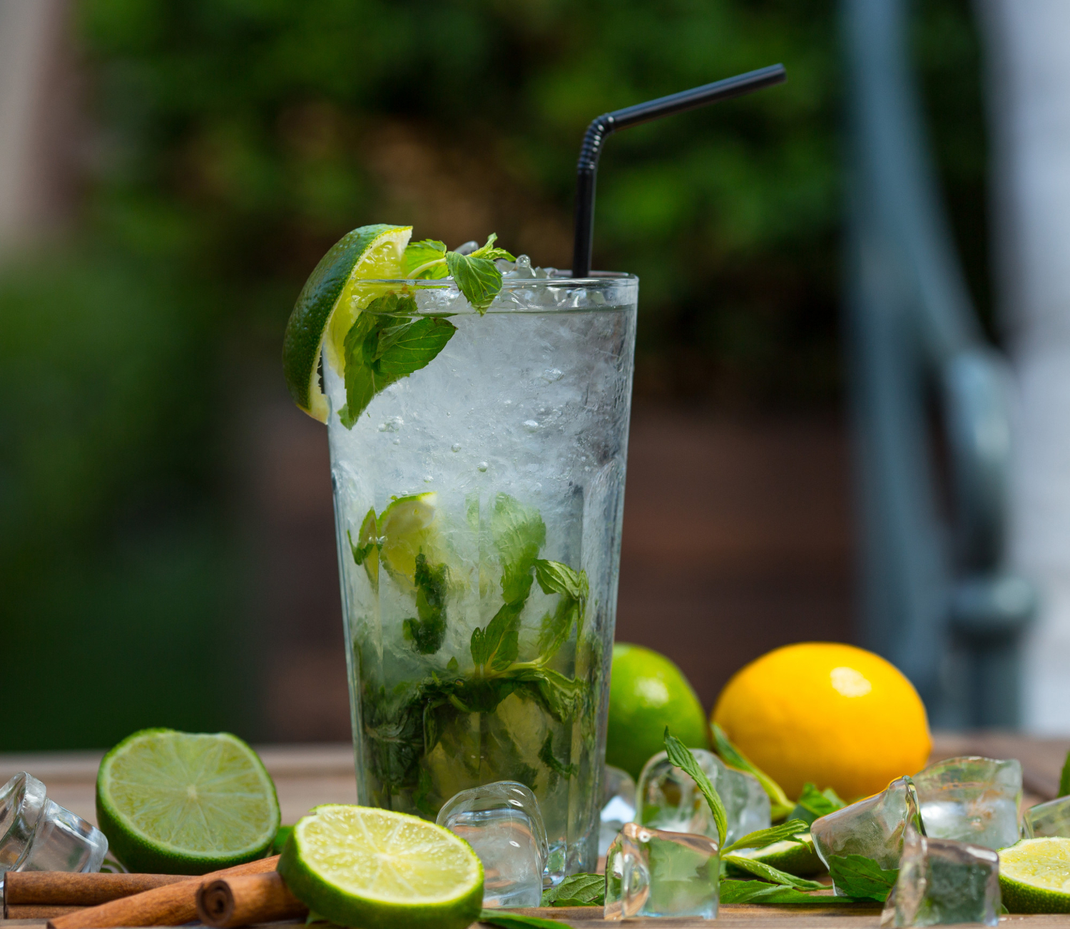 Refreshing cocktail made with rum, mint, lime, sugar, and soda water.