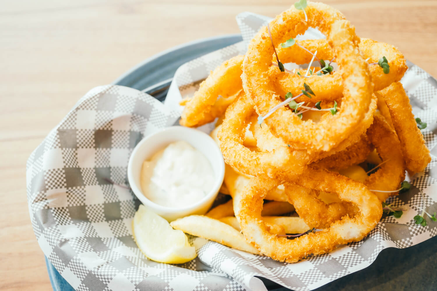 Crispy fried calamari served with marinara sauce and lemon wedges.